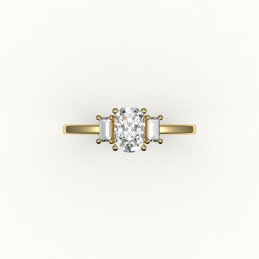 Engaste de tres piedras de corte cojín alargado con baguettes verticales