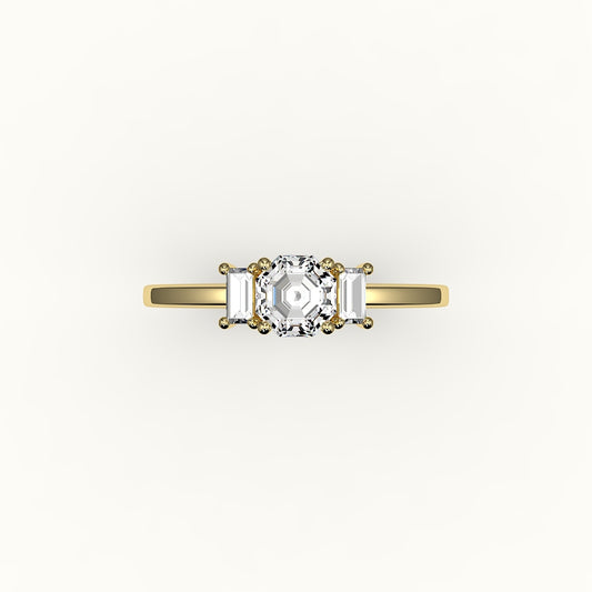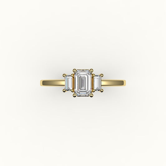 Engaste de tres piedras con corte octogonal y baguettes verticales