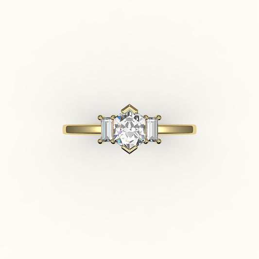 Engaste de tres piedras con corte hexagonal y baguettes verticales