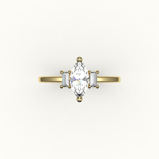 Engaste de tres piedras con talla marquesa y baguettes verticales