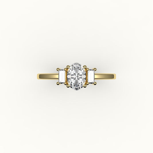 Engaste de tres piedras de corte ovalado con baguettes verticales