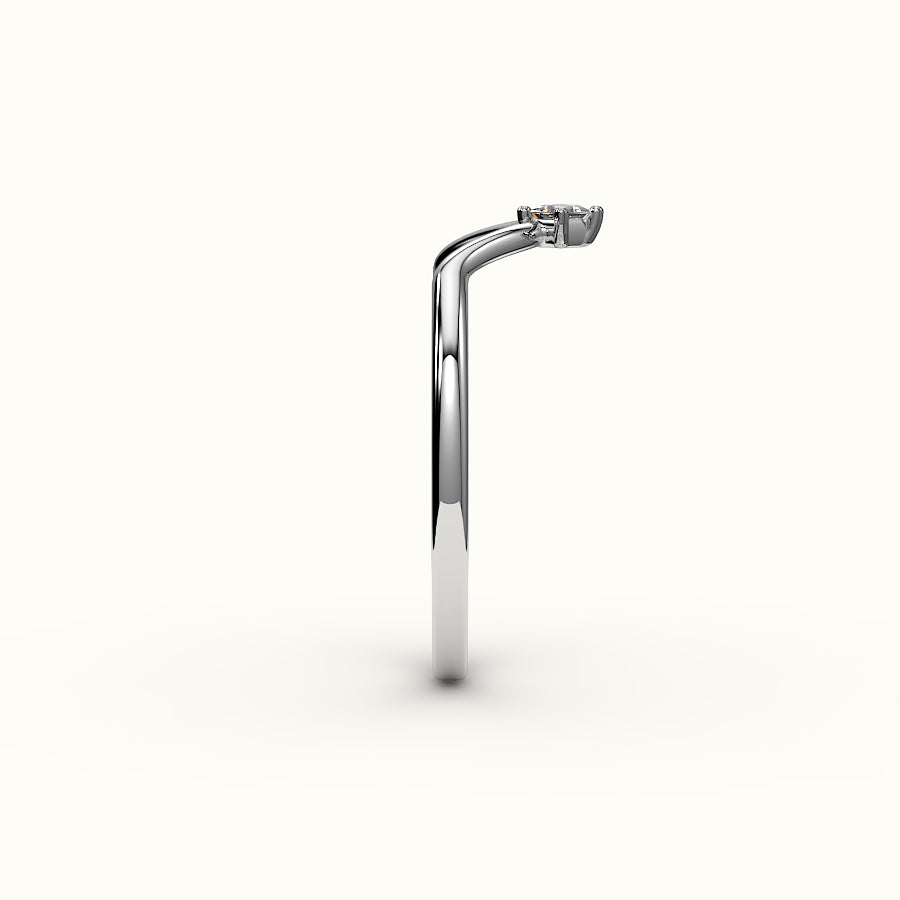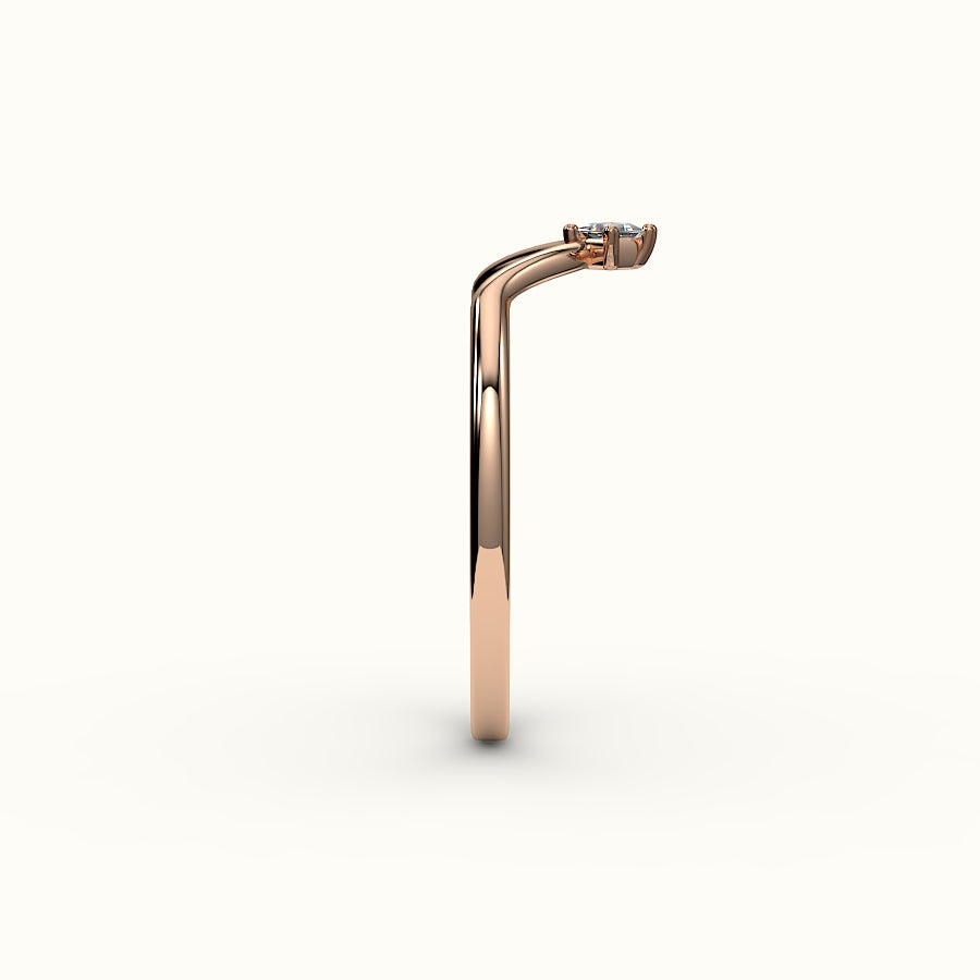 Un delicado arco de luz: esta alianza en forma de V luce un único diamante en su punta, diseñado para contornear la silueta de tu piedra central con precisión poética. Aporta una suave curva y un brillo sutil a tu conjunto, como un susurro de promesa envuelto en oro. Elaborada en oro macizo de 14 quilates, en amarillo, blanco o rosa, esta alianza se ajusta cómodamente y con elegancia.