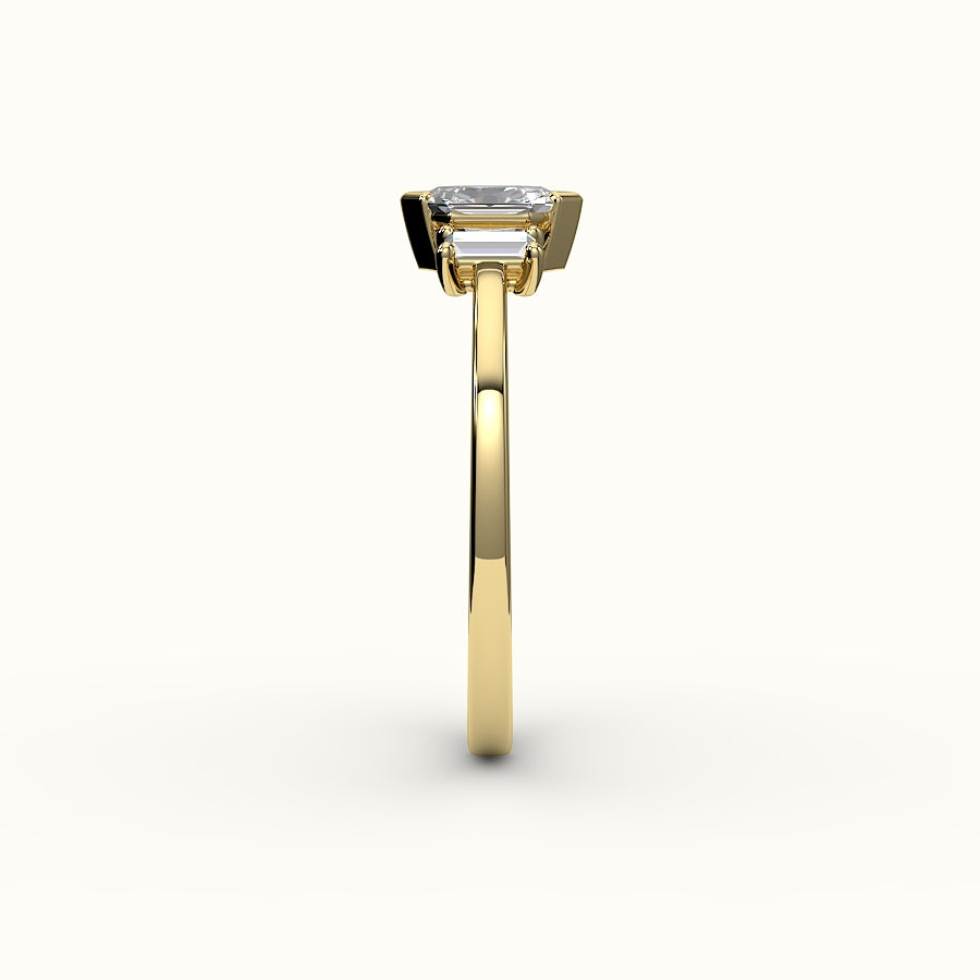 Engaste de tres piedras con corte hexagonal y baguettes verticales