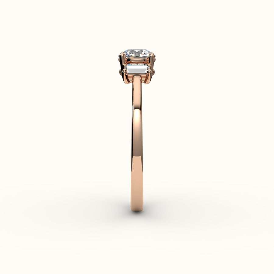 Simetría en su máxima expresión. Un centro brillante y redondo refleja el presente, flanqueado por piedras laterales baguette engastadas verticalmente: atemporales y deliberadas. El trío simboliza la vida en movimiento: dónde has estado, dónde estás y hacia dónde vas.