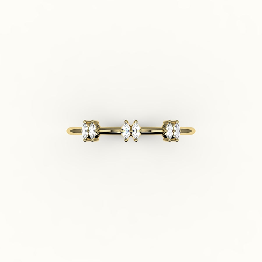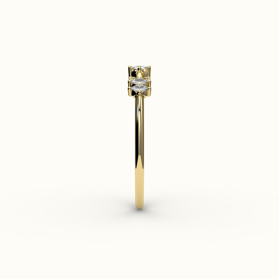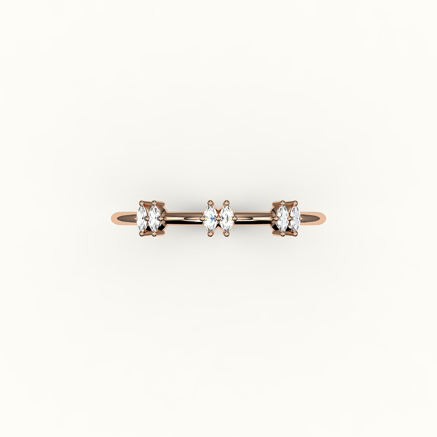 Elegancia inesperada: la alianza de diamantes marquesa omitida crea una danza de luz y espacio con diamantes marquesa, engastados en oro amarillo, blanco o rosa de 14k. Cada diamante es único y puede presentar ligeras variaciones en sus medidas y características de claridad. Todas las piedras se seleccionan cuidadosamente para garantizar que no haya inclusiones visibles. Disponible en opciones naturales y cultivadas en laboratorio. Si bien está diseñado para la elegancia diaria, este diseño se beneficia de un manejo cuidadoso para proteger sus delicadas piedras y su esbelta forma.